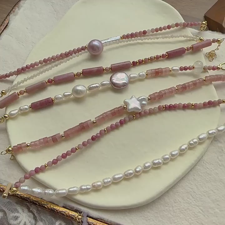 1.Strawberry Quartz + Star Pearl (15+5cm):Pentagram-cut freshwater pearls (rare 5-point symmetry) + Strawberry Quartz (attract soulmates)