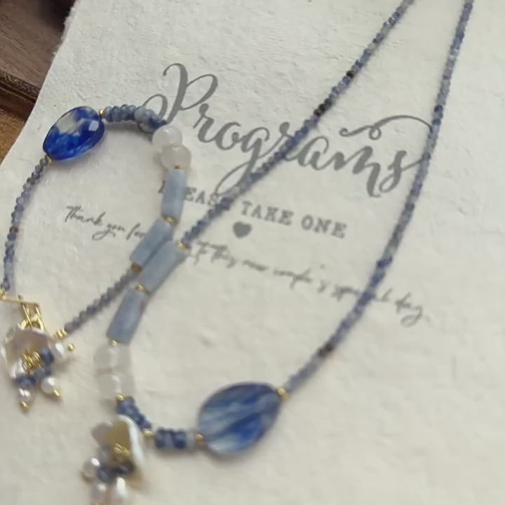 Hand-strung with tiny 2mm natural blue gemstones, creating a lightweight yet luminous aesthetic