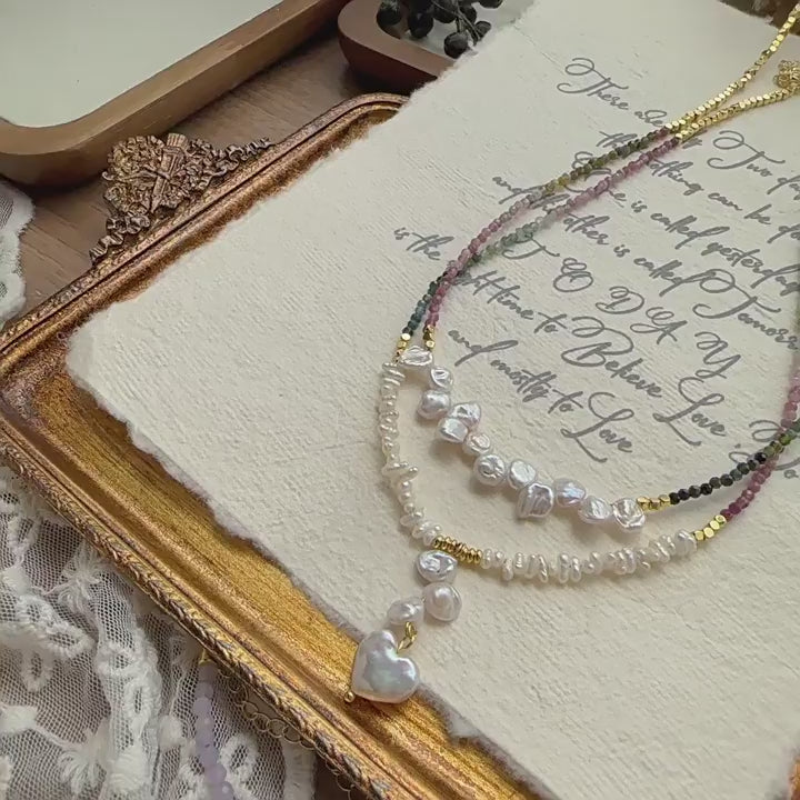 ◈ Layered Romance: Stack both necklaces – let the tourmaline strand frame the pearl heart at collarbone level.