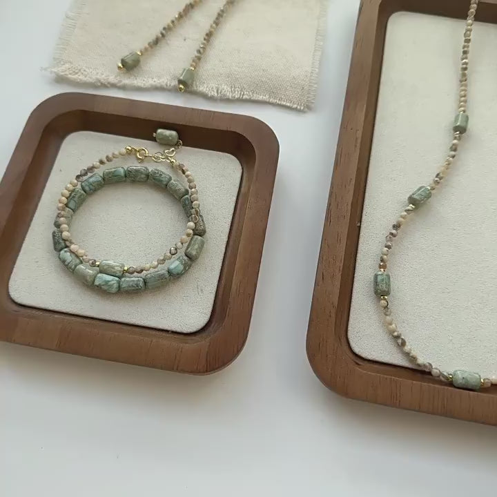 Connaect with nature’s tranquility through Jekira’s handcrafted green gemstone set, where ethically sourced serpentine, peridot, or moss agate beads embody renewal and balance. This versatile collection harmonizes organic textures with minimalist luxury, featuring copper-plated 18K gold accents for enduring elegance.