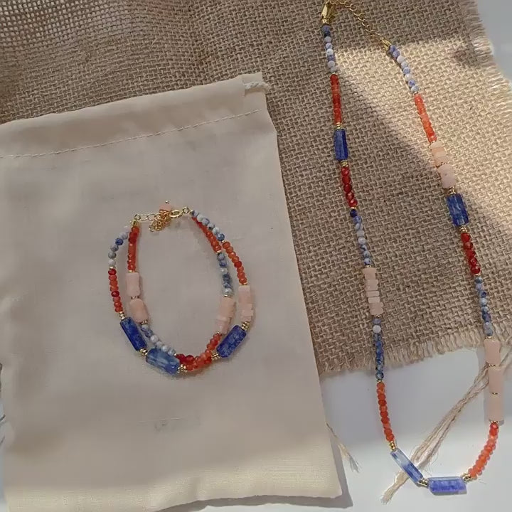 Design: Alternating beads of orange sapphire (sunset warmth), blue topaz (ocean depth), and blue crystal chips (sparkling ice), punctuated by red-orange agate rondelles for fiery texture.