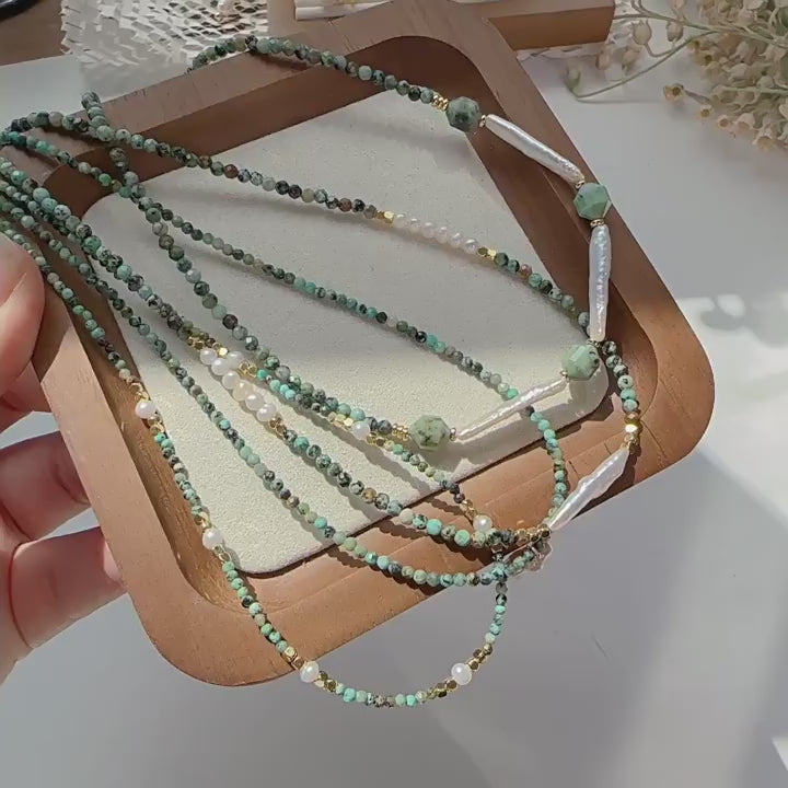 Embrace earthy elegance with this handcrafted necklace collection, blending natural turquoise (symbolizing protection and wisdom) and iridescent freshwater Baroque pearls. Each piece features copper-plated 18K gold-finish hardware, offering a seamless fusion of bohemian charm and modern minimalism.