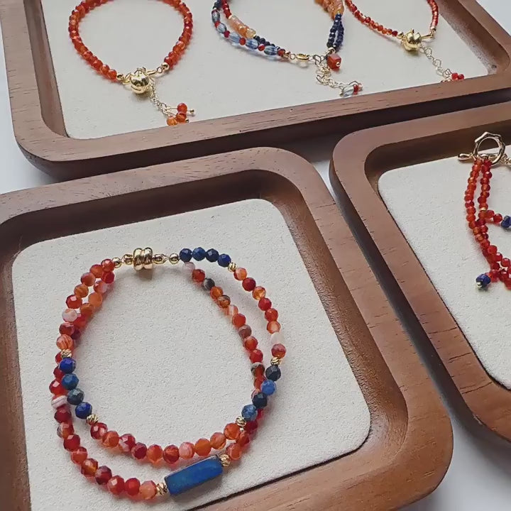 Step into a bohemian reverie with this 6-piece vintage-inspired collection, where fiery carnelian (vitality) dances with deep lapis lazuli (wisdom). Each handcrafted bracelet features copper-plated 18K gold hardware and channels nomadic elegance – from minimalist strands to intricate layered designs, all echoing the spirit of ancient trade routes.