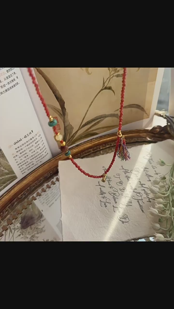 Celebrate the vibrant fusion of tradition and nature with this exquisite necklace and bracelet duo. Hand-strung with fiery Nanhong agate "rice beads," serene turquoise, and golden citrine, this set embodies the balance of Chinese cultural symbolism and modern bohemian elegance. Perfect for stacking or wearing separately, it complements both Hanfu-inspired attire and everyday casual styles.